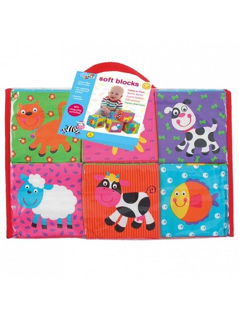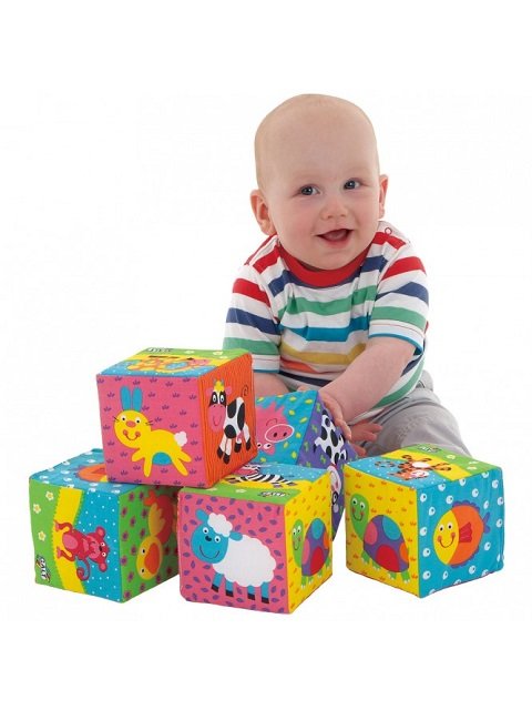 Тези меки цветни кубчета са идеално допълнение към играта на всяко дете. Бебетата над 6 месеца ще могат да ги подреждат, хвърлят и стискат, да научат 12 различни животни, както и да си правят високи кули от тях. Тези кубове са предназначени да помогнат на децата да разпознават лесно цветовете, а дори след време да се научат да броят от 1 до 6. Могат да се перат в пералня.