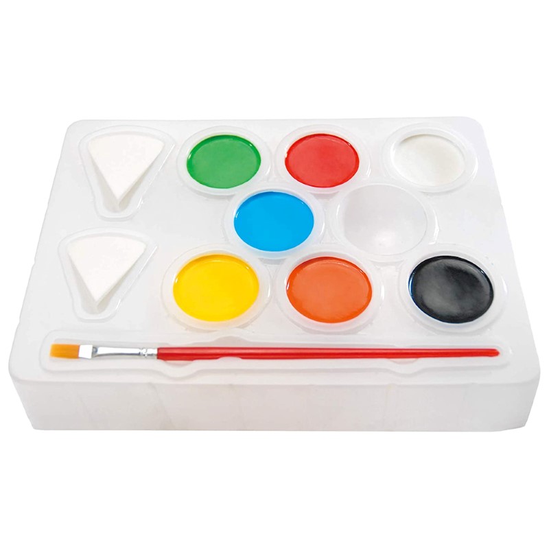 Съдържание на комплекта: палитра със седем цвята (бял, черен, жълт, оранжев, червен, син, зелен); стикери за лице, четка; 2 гъби; шаблони; упътване.