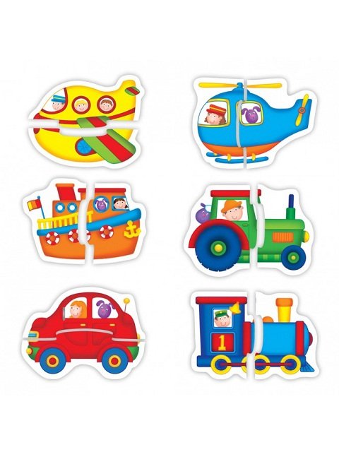 Този забавен пъзел е предназначен за много малки деца. Съставен е от шест различни превозни средства, разделени на по две части. Целта му е да насърчи ранните умения и сръчността на децата, както и лесно да се научат съответните фигури.