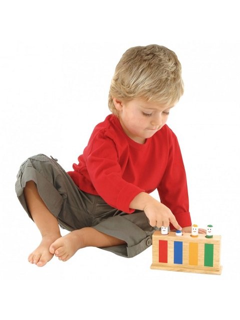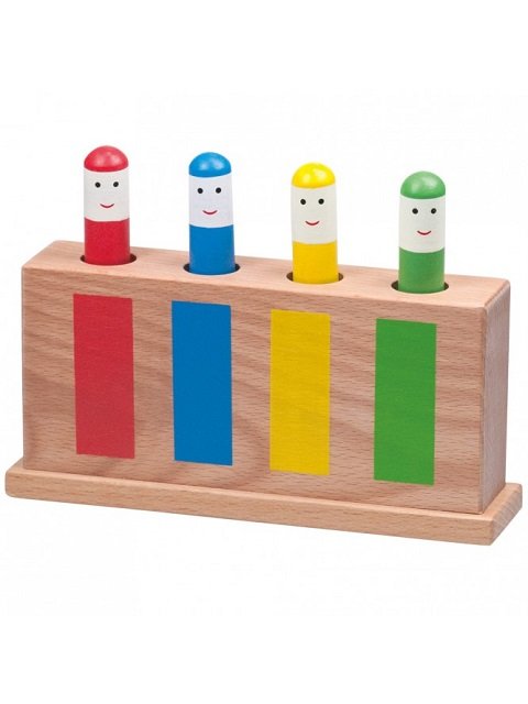 Забавна дървена играчка с 4 различни цветни фигури, които се показват и скриват с помощта на пружини. Идеална е при развитието на децата, тъй като стимулира техния интерес и координация на очите и ръцете им. Играта е изработена от качествено дърво.