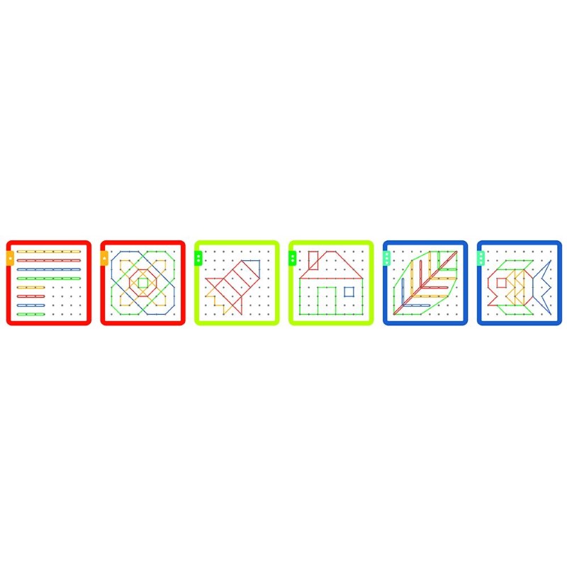 Картите са ясно структурирани и позволяват на детето постепенно да преминава към по-сложни модели. Ластиците са достатъчно еластични и лесни за използване от малки ръце, а компактният размер на дъската улеснява пренасянето и съхранението.