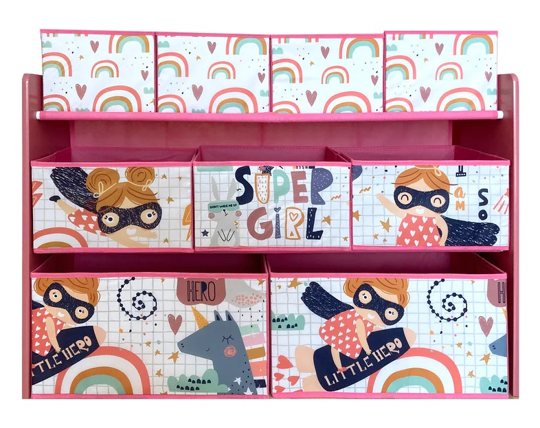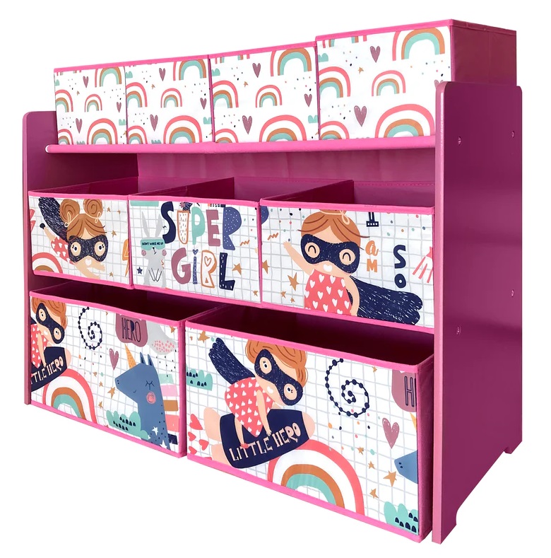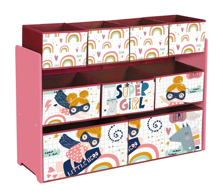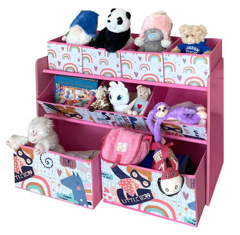Красива дървена етажерка, разполагаща с 9 подвижни текстилни кутии с различни размери, която ще ви послужи като органайзер за съхраняване на играчки, книжки и принадлежности за писане и рисуване на вашите деца. Тя е чудесно допълнение за всяка детска стая, хол и детска градина.