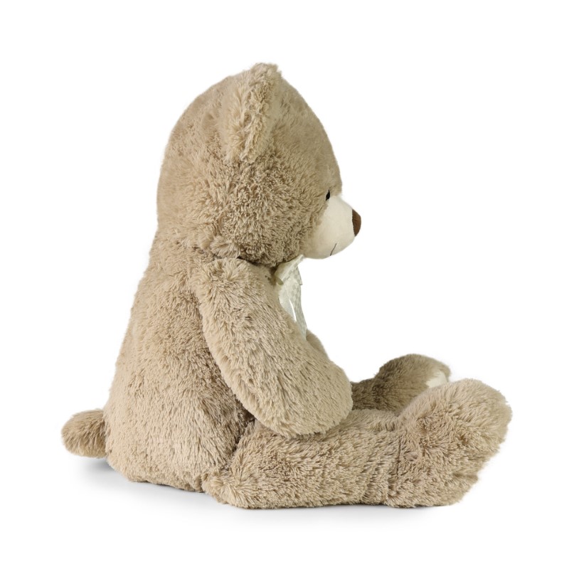 Изработено от висококачествен мек плюш, мечето впечатлява с изключително приятна текстура и топъл цвят капучино. Неговият класически дизайн е допълнен от елегантна кремаво-бяла сатенена панделка, която придава стил и завършеност на визията му.