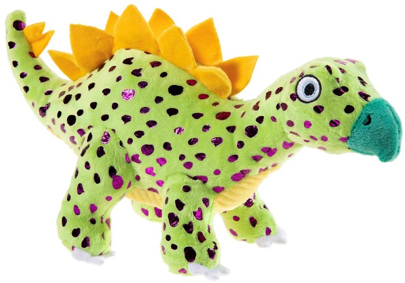 Забавният пухкав динозавър в зелен цвят, с жълт гребен с шипове и забавни лилави точки, които магически блестят на светлината, ще осигури часове забавления на децата.