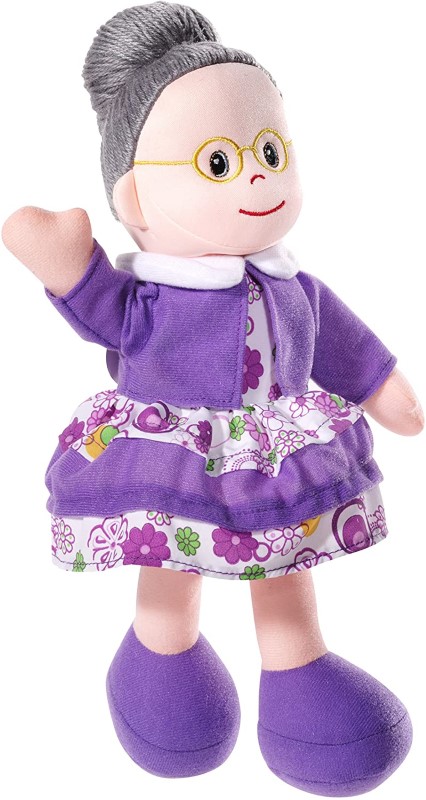 Тази засмяна кукла – баба е изработена от смесен материал и е облечена с цветна лилава рокля и е със сива коса вързана на кок. Бабата е с бродирани очи и усмивка, което я прави безопасна за игра от най-малките деца.