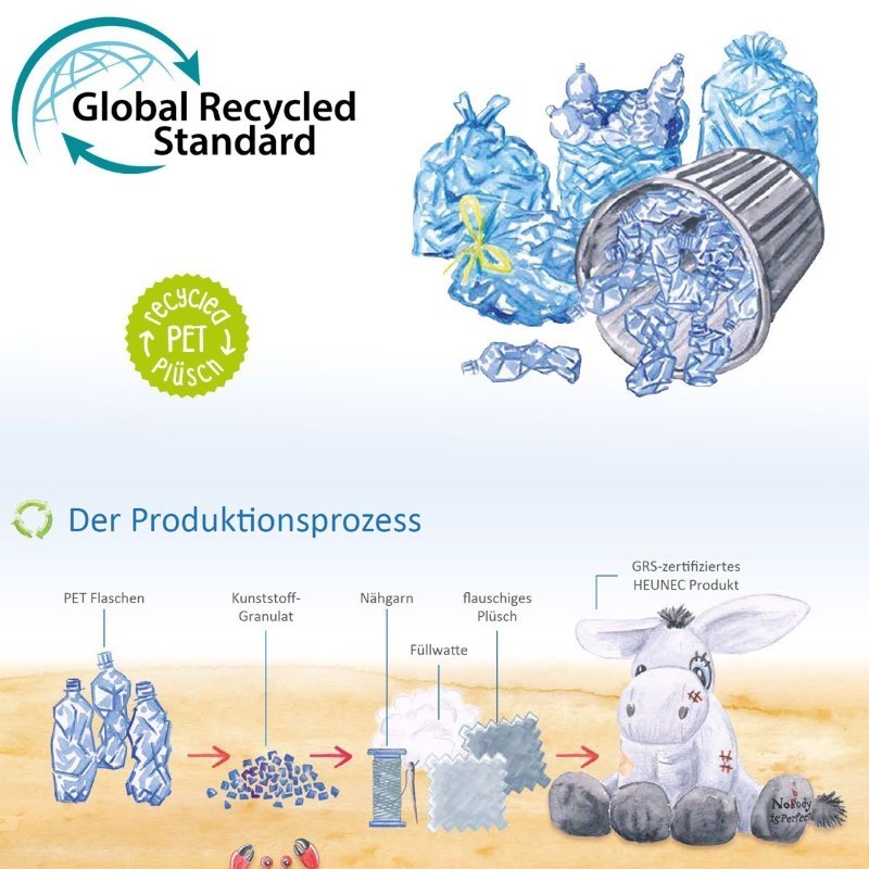 Плюшената играчка е изработена от рециклирани пластмасови бутилки и по този начин допринася за по-добра устойчивост.