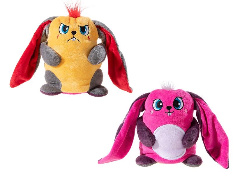 Плюшеното зайче Изи има две лица, като всяко лице показва различно настроение. Можете да ги обръщате според настроението си – едното лице е щастливо, а другото сърдито.