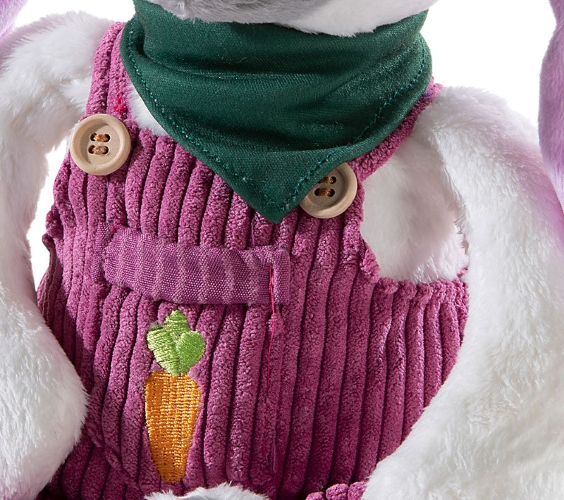 Плюшеното зайче на име Мара обича най-много да си похапва моркови! Затова върху джобчето на нейният лилав гащеризон е избродиран морков, който да и напомня за нейните предпочитания.