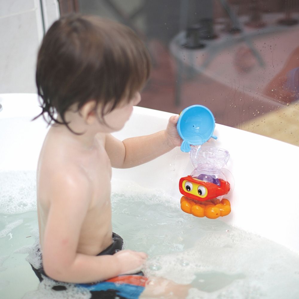 * октопод – напълнете октопода с вода и вижте как очите му ще оживеят и ще започнат да се движат. Вижте как водата ще започне да изтича от пипалата му. Можете да го залепите за ваната или плочките в банята с помощта на вакуум вендузата на гърба му. Размери: 17 х 17 х 22,5 см