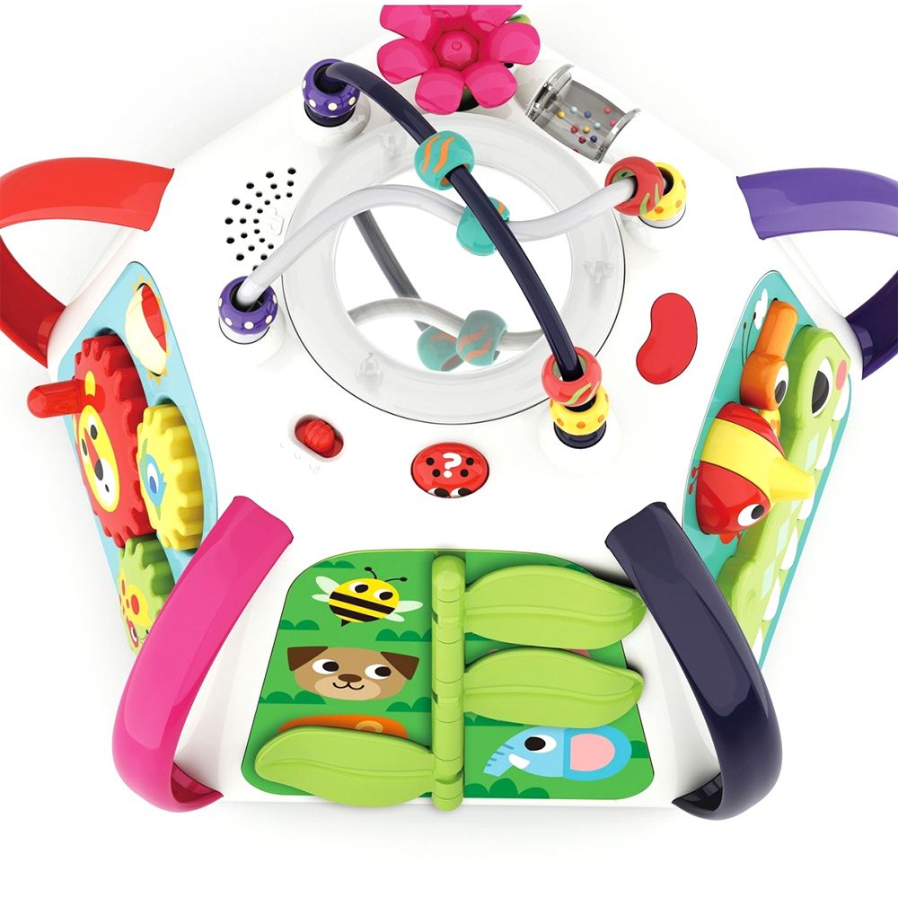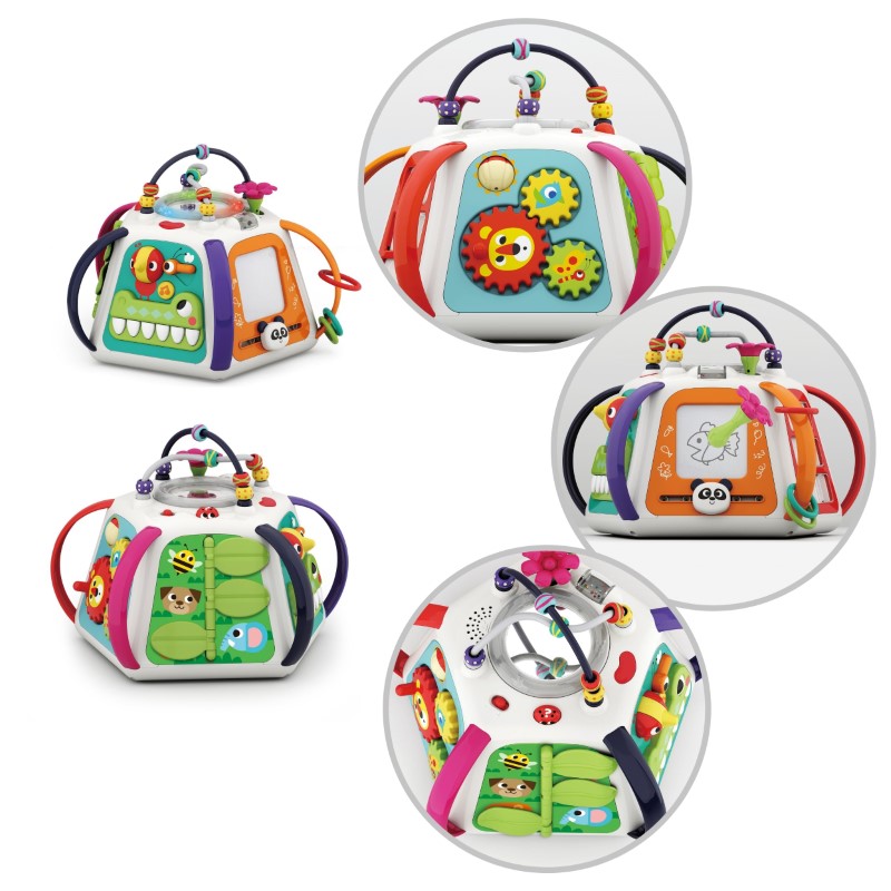 Върху играчката са разположени лабиринт, дъска за рисуване, светещо огледало, въртящи се зъбни колела, други образователни играчки и има прекрасен дизайн. Играта с него със сигурност ще развие бебешкия интелект, децата ще наблюдават и изследват взаимодействието между действия, звуци и движение. Работи с 3 АА батерии, които не са включени.