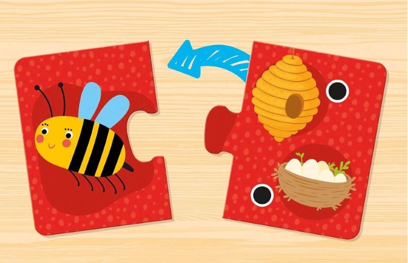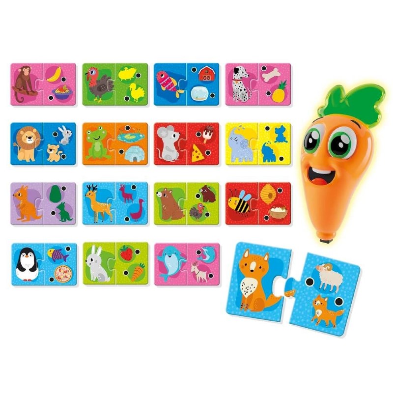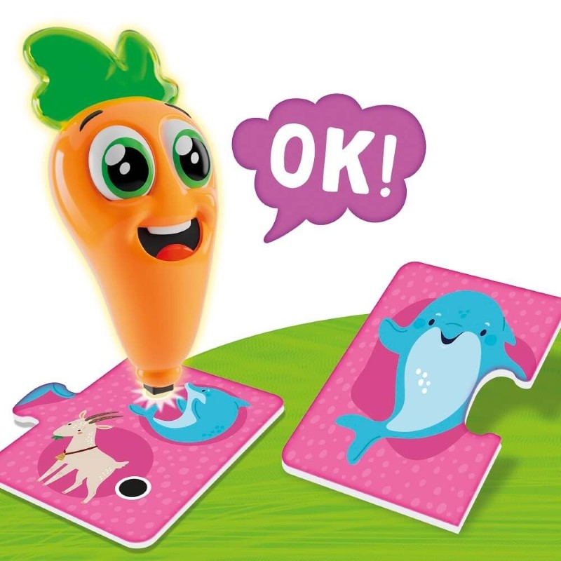 Първата задача на децата е да наредят правилно пъзелите, състоящи се от по 2 част. След това могат да използват детската писалка морков, за да отговарят на интерактивните въпроси, като натискат върха на писалката върху черното кръгче, което съответства на избрания отговор. Ако отговорът е правилен, писалката ще реагира с похвала. Важно е винаги да насърчавате децата и нежно да ги приканвате да опитат отново, ако отговорът им е неправилен.