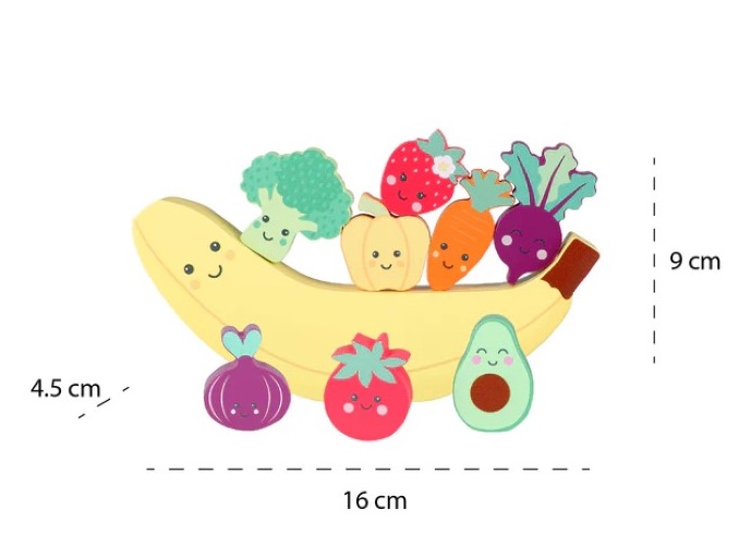 Забавна детска игра, в която малчуганите ще трябва да подреждат и балансират различни зеленчуци върху банан, като се опитват да не падат. Частите могат да бъдат подреждани по различни начини за да се създадат всякакви различни формации.