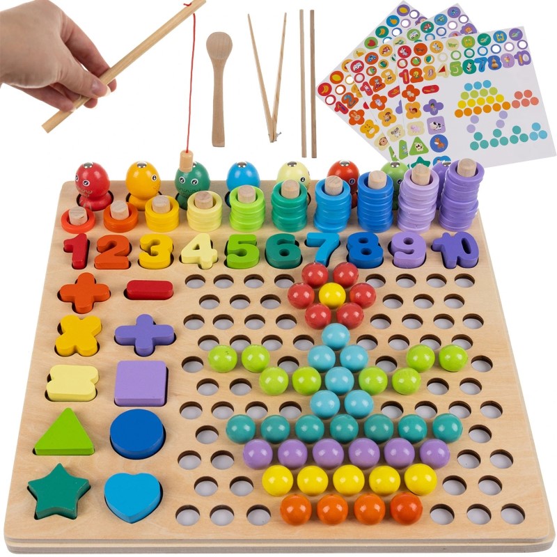 Комплектът съдържа много цветни елементи, които ще събудят въображението на малчуганите, ще развият техните умения и ще им помогнат да се научат да смятат. Играчката наподобява пъзел, в който са включени сортер с рингове, риболов, мозайка с топчета, геометрични формички и числа. Заниманията с нея ще осигурят много весели часове на детето, ще насърчат координацията ръка-око и ще научат мъниците на логическо мислене, освен това ще развият концентрацията и търпението.