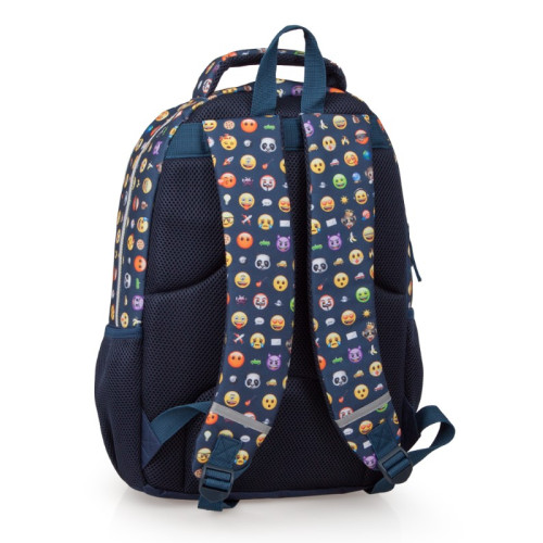 Тази раница ще ви плени със своите закачливи Емотиконки, както и със своята визия, дизайн и качество на изработка. Тя е просторна и има достатъчно отделения и място за да съберете всичките си учебници, принадлежности или вещи за деня. Изработена е от висококачествени и здрави материали. Раницата разполага с две просторни отделения, затварящи/отварящи се с ципове, преден джоб с цип и два странични мрежести джоба подходящи за бутилки с вода или сок. Удобна е за носене на гърба, благодарение на подплатената и мека комфортна материя и широките контурни регулируеми презрамки, които намаляват напрежението на гърба при носене. Разполага и с удобна и мека дръжка за носене. Подходяща е за училище, извън класни дейности, екскурзии, спорт.
