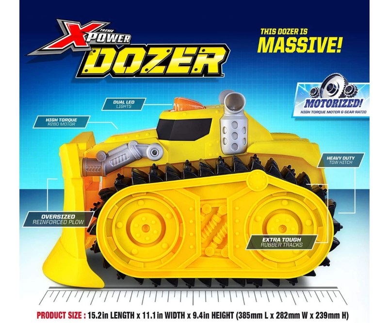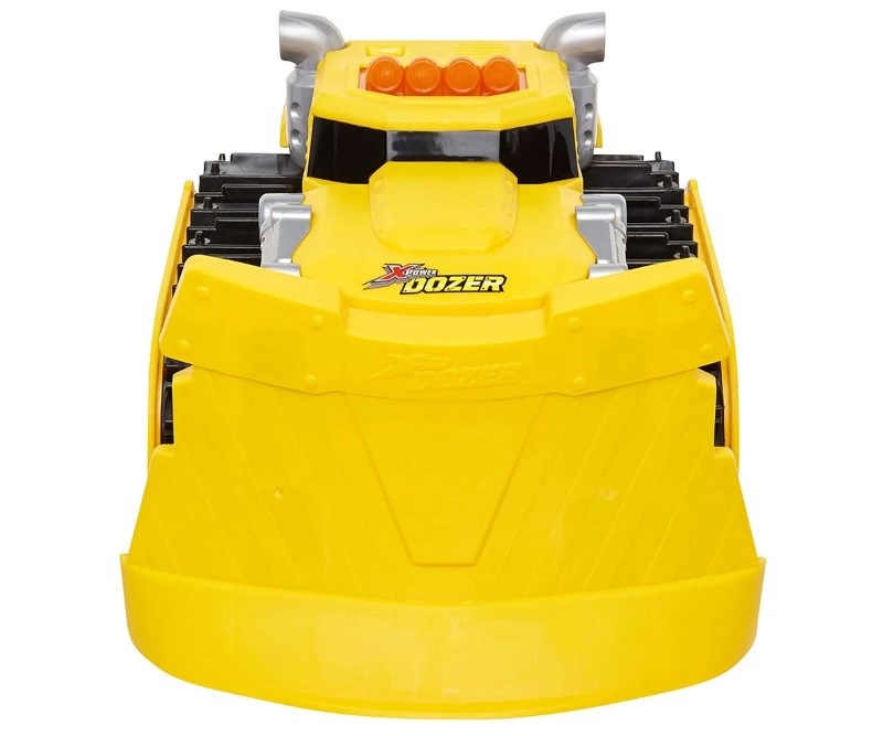 Изработен е от пластмаса и разполага със светлинни и звукови ефекти, които се активират посредством бутон. За булдозера няма пречка, която да застане на пътя му, а благодарение на грайферните вериги ще може да минава по всякакви терени. Освен това той е мощен и може да избутва тежести до 90 кг.