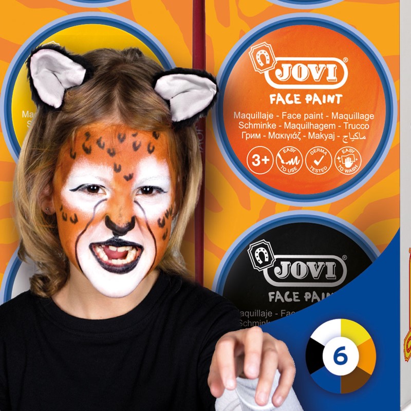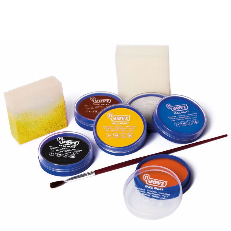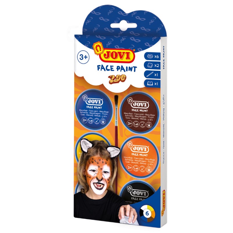 Комплект с бои за рисуване върху лица, съдържащ 6 цвята х 8 мл, 2 тампона за нанасяне, четка и книжка с примерни рисунки.