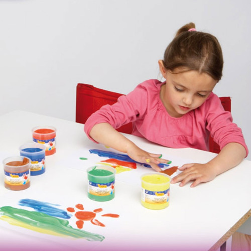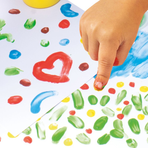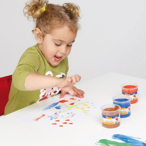 Комплектът от 5 цветни боички, с които децата могат да творят на воля използвайки своите пръсти, вместо четка за рисуване. Боите са на водна основа с изцяло растителни съставки, напълно безвредни и приятни на допир. Лесно се измиват от ръцете.