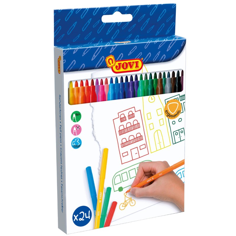 Комплект от 24 флумастери с ярки и наситени цветове, с триъгълна форма в зоната на хващане, което допринася за удобството при писане и рисуване. Флумастерите са с много здрав и устойчив връх 2,8 мм, мастилото е от хранителни багрила, издържат 96 часа без капачка. Подходящи са за рисуване върху всякакви материали.
