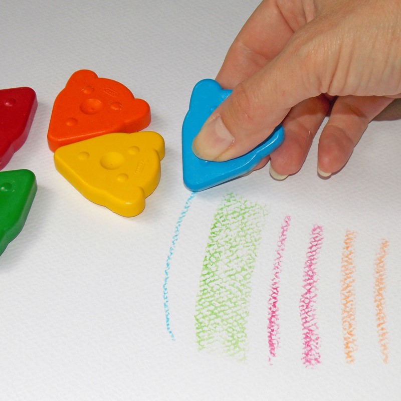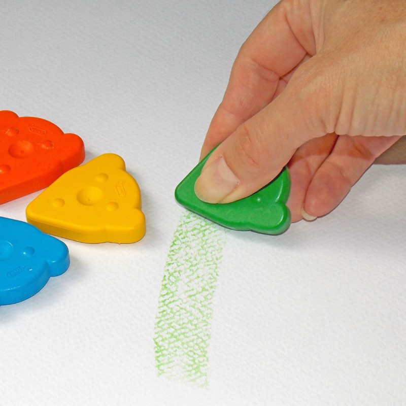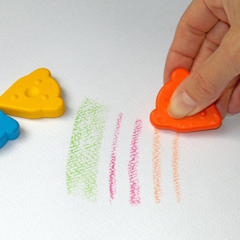 Комплект от 10 цветни пастели за рисуване с форма на мечета, които освен че ще предизвикат интереса на децата, са и много удобни за хващане. Имат специално място за пръстчетата и затова се използват без напрежение в малките ръчички. Пастелите са с ярки и наситени цветове и с тях могат да се правят равномерни щрихи, както и направата на различни текстури. Могат да се нанасят плътно на лист и да се използват за многослойна техника на рисуване. Подходящи са за рисуване върху всички видове хартии, картони, както и върху дърво и неравни повърхности. Пастелите са без мирис, не цапат и не оставят лепкави следи по ръцете. Лесно се острят.