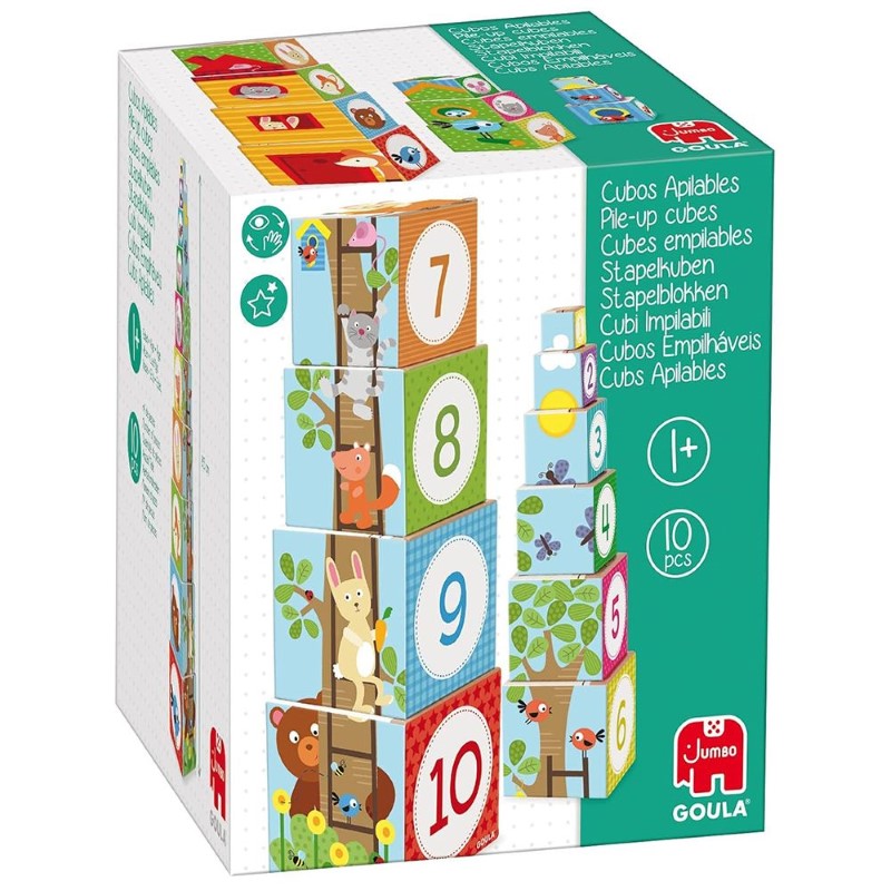 Комплект от 10 картонени кубчета с животни, с различни размери, които могат да бъдат подредени едно върху друго или да бъдат поставени едно до друго, като всяко кубче включва картинка на горски животни, число.