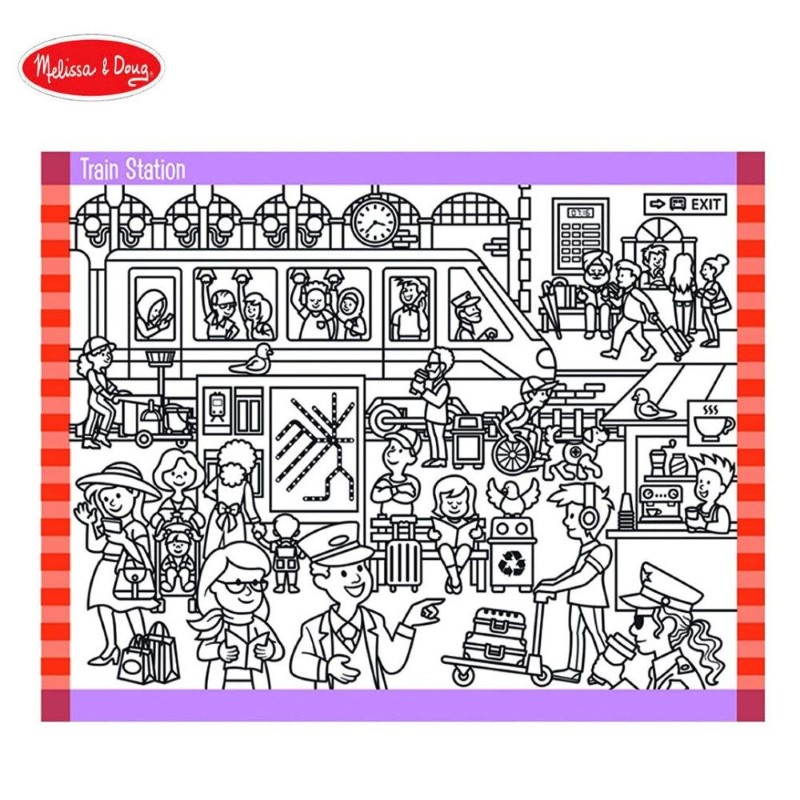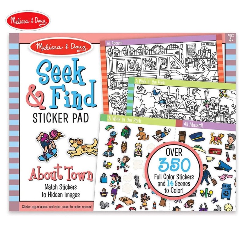 Книжката за оцветяване със стикери Град от Melissa and Doug предлага творческа и занимателна дейност, която комбинира оцветяване и поставяне на стикери. Богатите на детайли сцени включват фермерски пазар, болница, магистрали, парк, училище, летище, увеселителен парк, ресторант, мол, музей, кафене, строителна площадка, автогара и пожарна, позволявайки на децата да създават разнообразни градски истории и сцени.