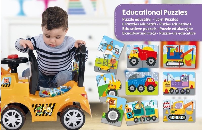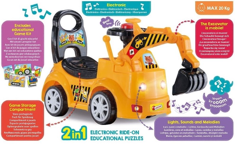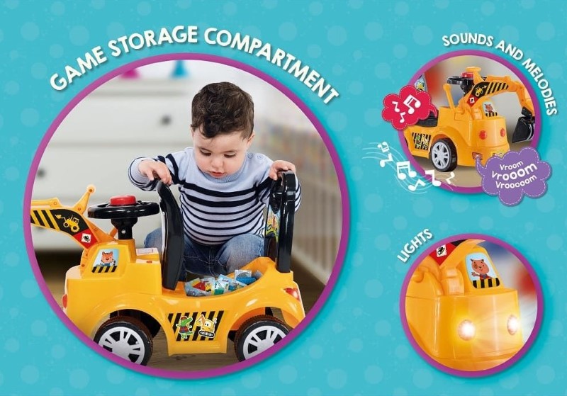 Булдозера е с интерактивен дизайн, със светлини, звуци и мелодии, които ангажират децата, докато играят. Рамото на булдозера е подвижно за по-реалистична игра на строител, а багажника му ще намерите 8 образователни пъзела. Колата за каране има здрава конструкция, издържаща до 20 кг, тя е идеална за активни и въображаеми игри.