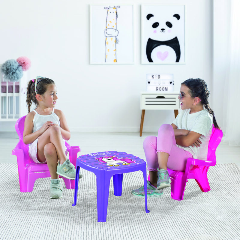 Комплект от пластмасова маса и две столчета, идеални за игра и учене от децата. Подходящи са за детска стая, тераса или в градината. Изработен е от висококачествена и устойчива пластмаса, подходяща за всякакви атмосферни условия. Лесно се почистват с влажна кърпа.