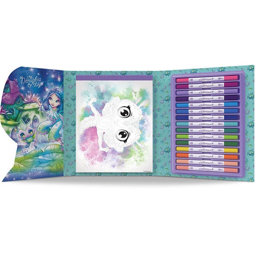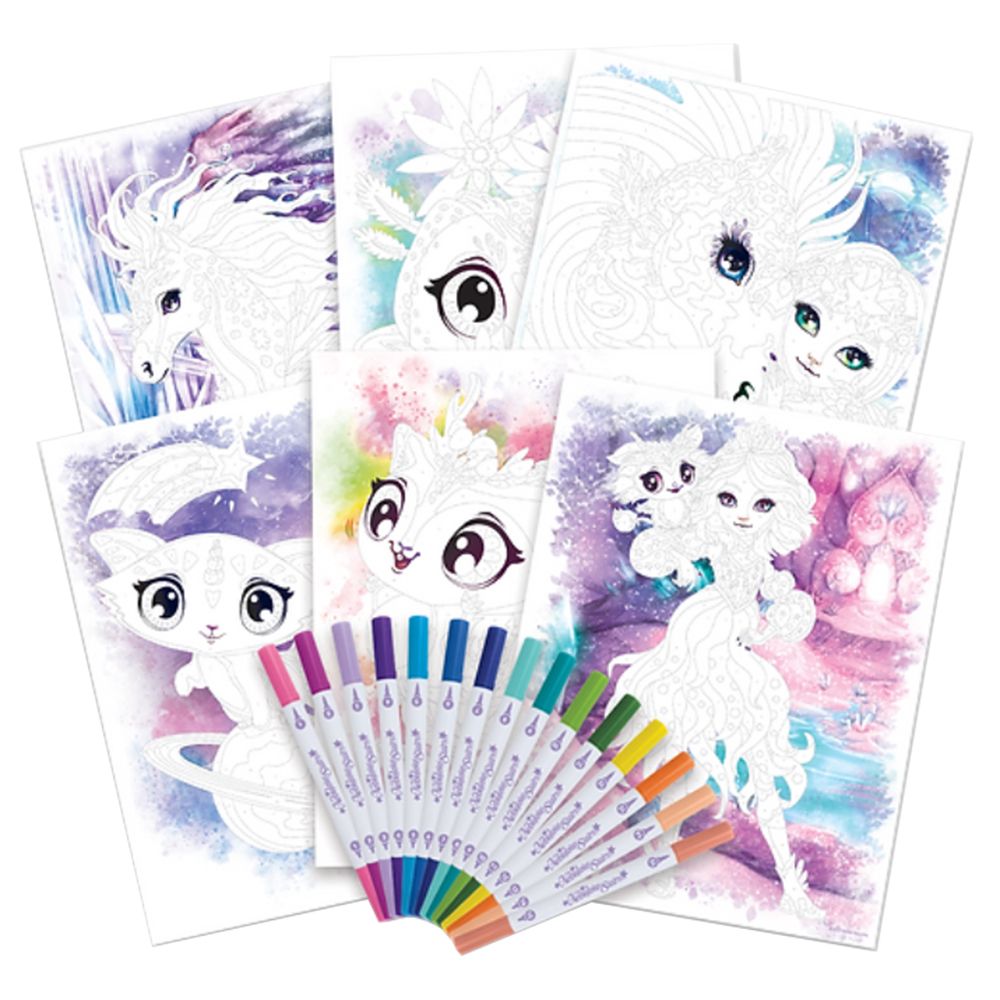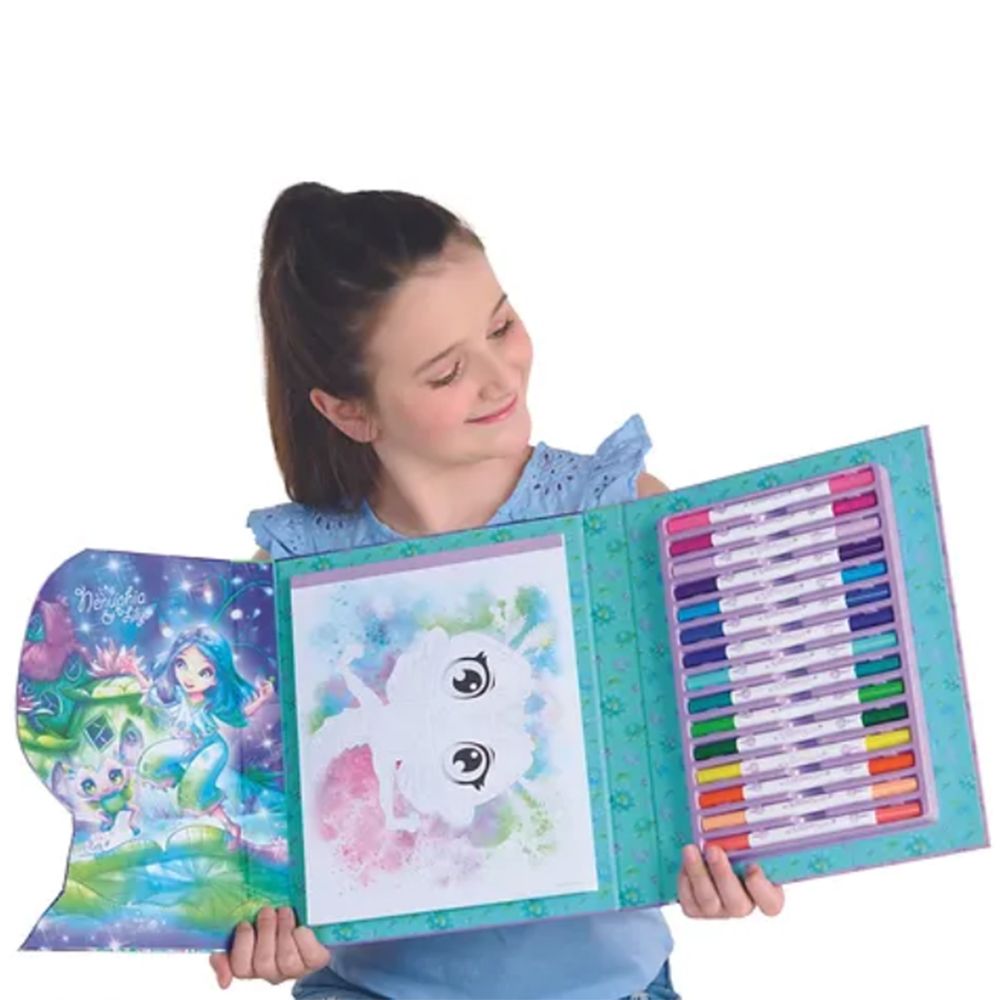 Детски комплект за рисуване по номера с включена книжка и 15 цветни двувърхи флумастери, с които детето ви ще може да създаде красиви рисунки с Звездните принцеси от Nebulous Stars.