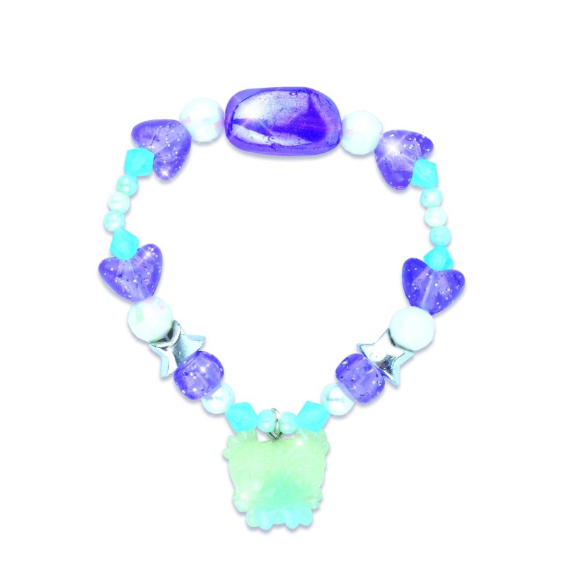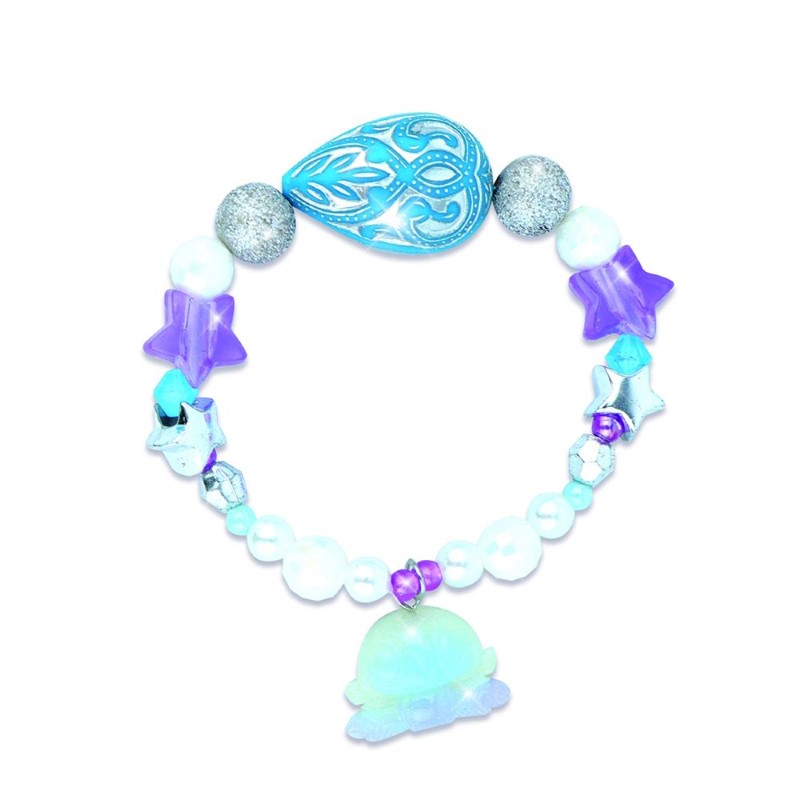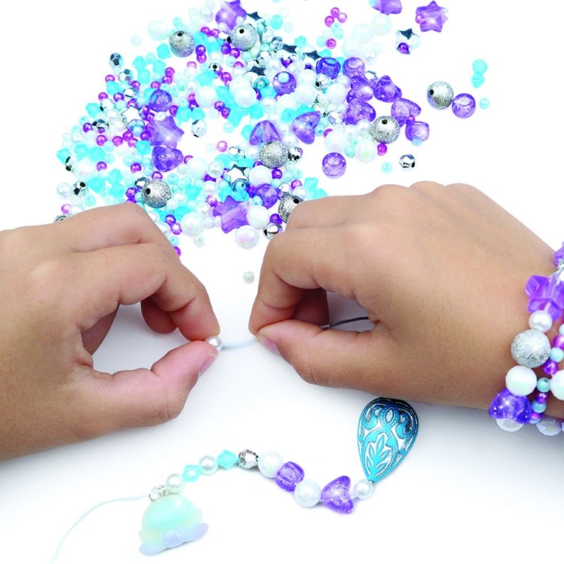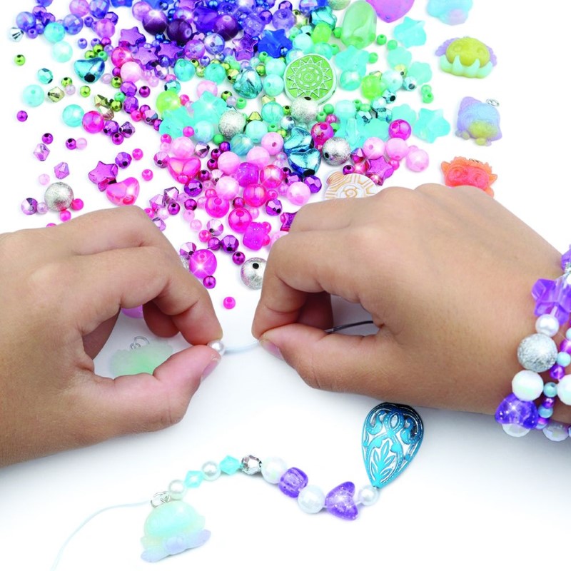 Комплект за изработка на бижута, съдържащ голямо разнообразие от цветни мъниста и 8 красиви талисмана, с които вашите деца ще могат да направят красиви гривни и гердани за тях и приятелите си.