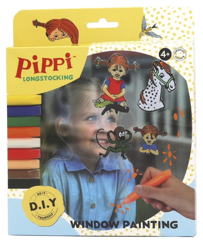 С този забавен комплект, децата могат да изрисуват 4 различни дизайна на Пипи, върху пластмасови стикери, които след това могат лесно да се залепят на прозорци или стъклени повърхности. Стикерите могат лесно да се местят и не оставят следи или остатъци от лепило върху прозореца. Комплектът съдържа 9 различни бои, така че децата могат да избират любимите си цветове и да направят всяка картинка уникална. Лесен и забавен за използване – креативна идея за подарък за малки фенове на Пипи!