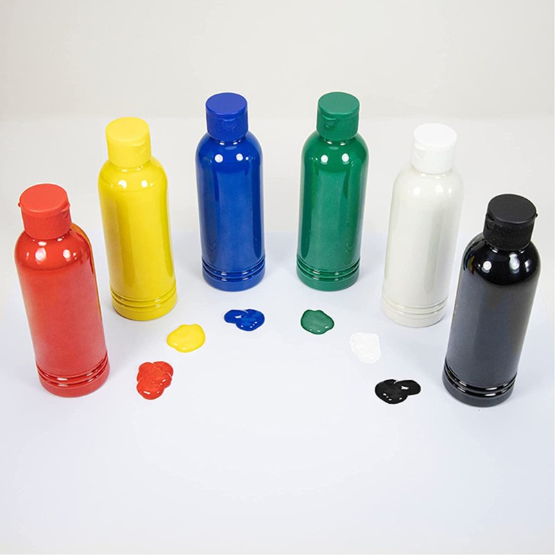 Комплектът съдържа 6 x 250 ml, безвредни цветни боички, не токсични и безопасни за употреба. Те са в ярки топли цветове и се почистват лесно.