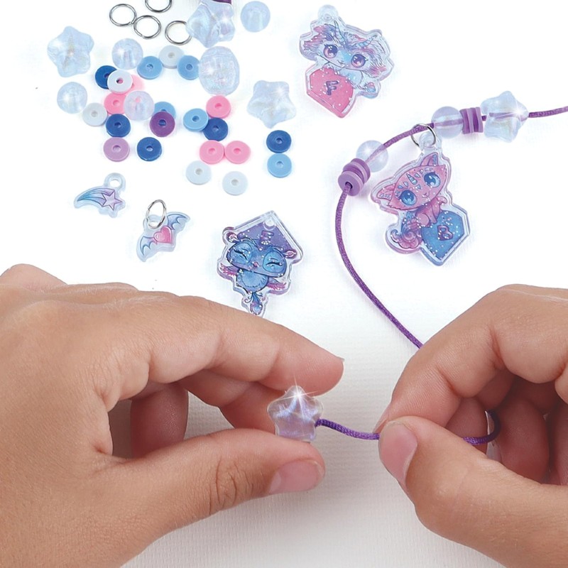 Комплектът включва: 7 блестящи акрилни щамповани висулки, 7 мини акрилни щамповани висулки, 84 различни мъниста, 14 скоби за закопчаване, 7 цветни копринени шнура, лист със стикери с кристали и цветни инструкции.