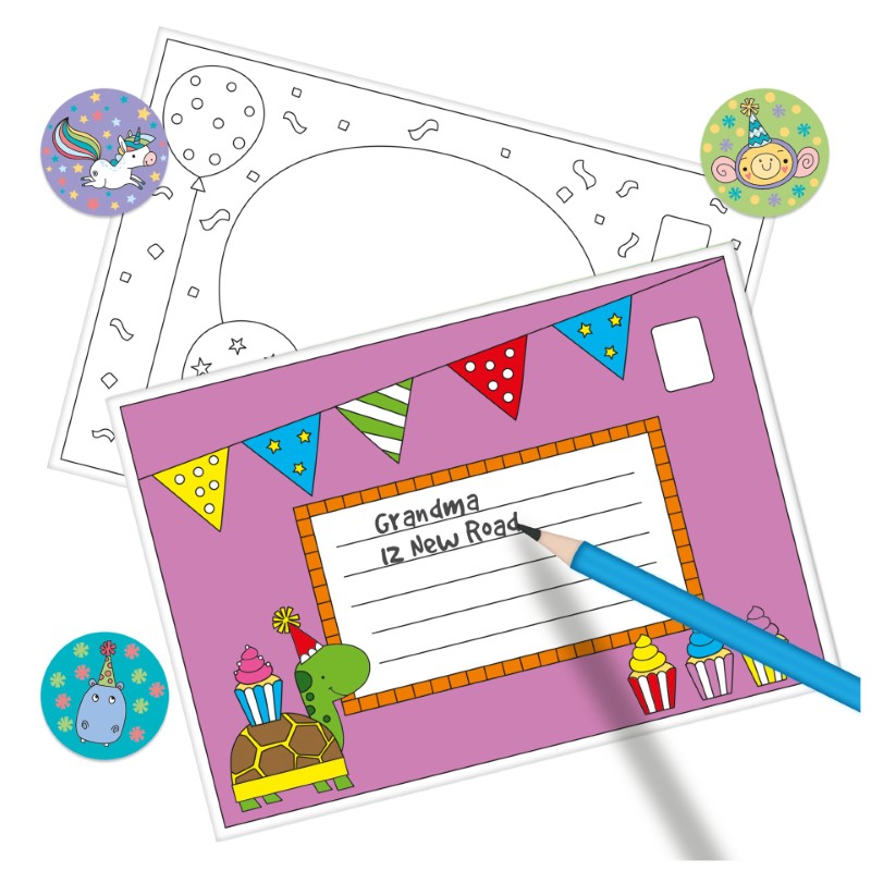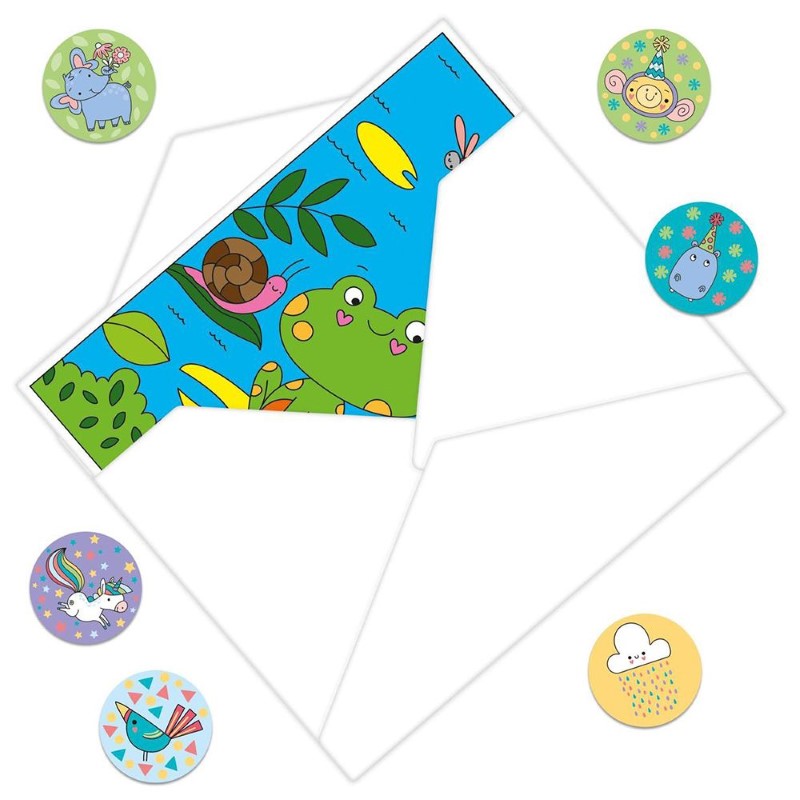 Забавлявайте се и творете с тези комплект, който ще ви позволи да оцветите 12 картички с пликове и да изпратите на приятели и семейство. Добавете свой собствен поздрав и запечатайте пликовете с весел стикер.