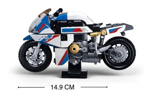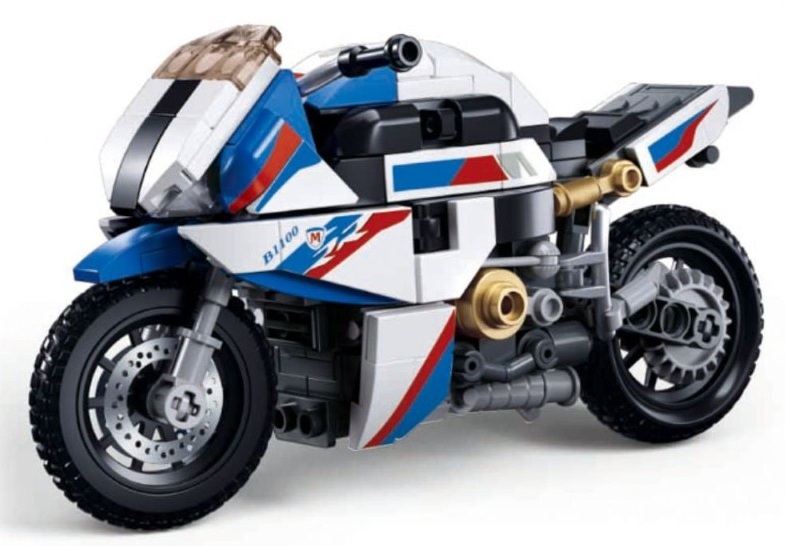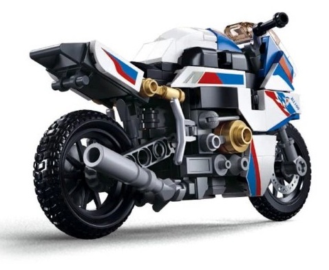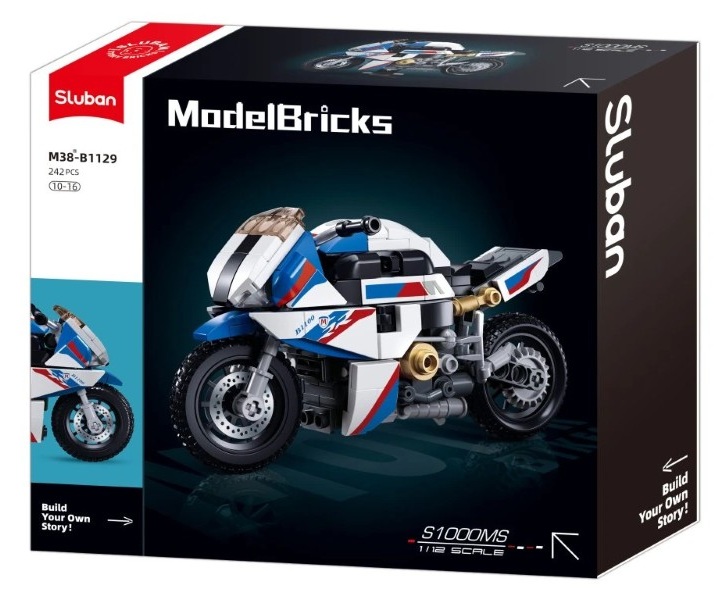 Конструктор с пистов мотор модел S1000 MS, който е част от новата серия от шестте модела мотоциклети на Sluban. С дължина от почти 15 см в сглобено състояние и стилен дизайн в бяло със сини и червени елементи, този модел е атрактивно допълнение за всички фенове на мотоциклетите. Моделът е оборудван с малка стойка, която позволява излагането му на показ.
