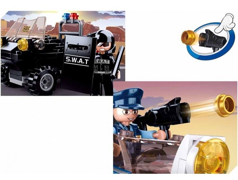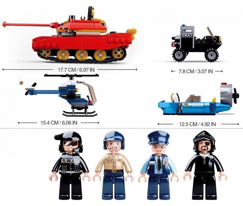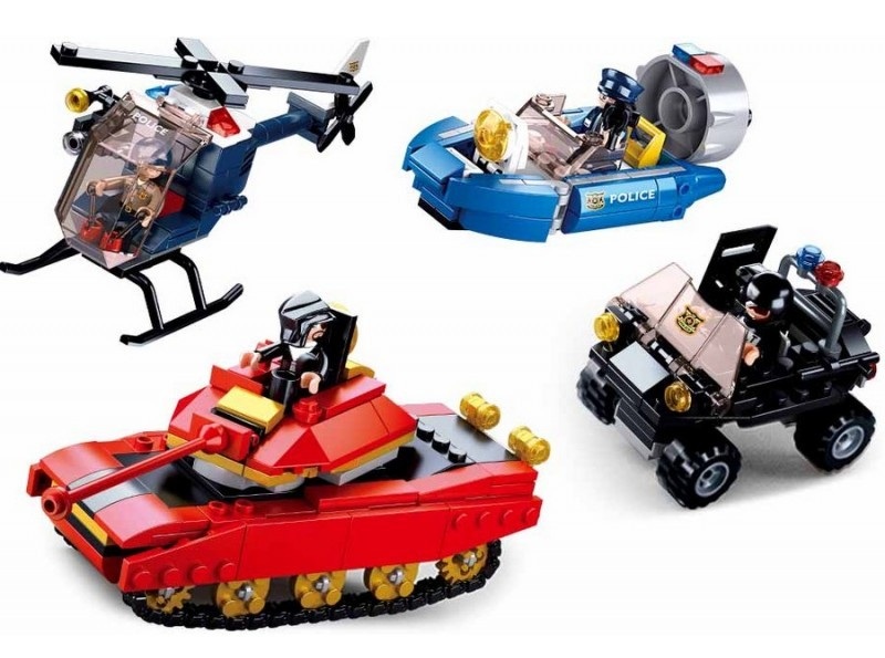 Конструктор от 460 части за сглобяване на полицейски джип, хеликоптер и моторна лодка, които са на мисия за преследване на танк по суша и вода.