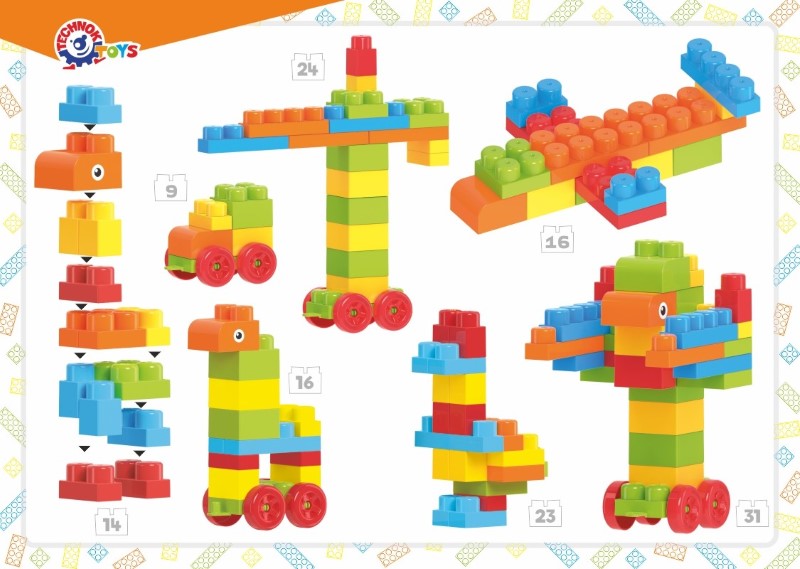 Конструктор включващ 100 едри части, подходящи за деца над 2 години. Комплекта съдържа различни елементи, с които могат да се конструират кораби, сладки животни, кола, влак, самолет, робот и още много други.