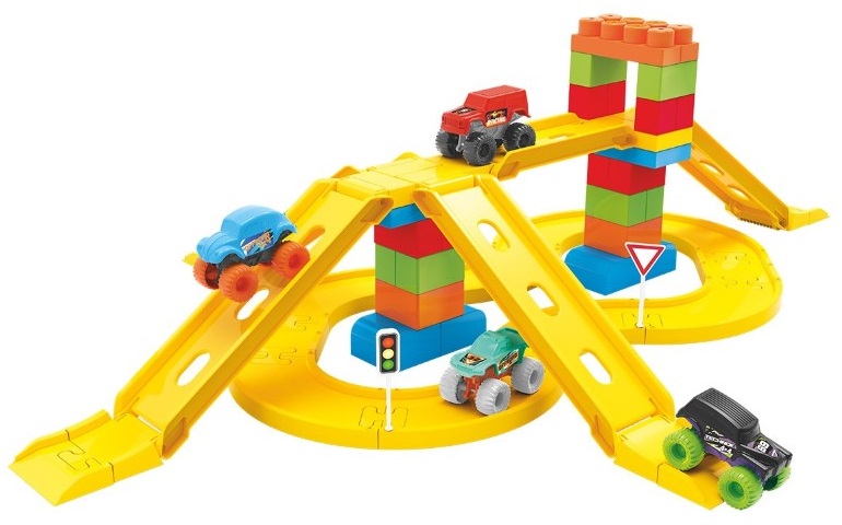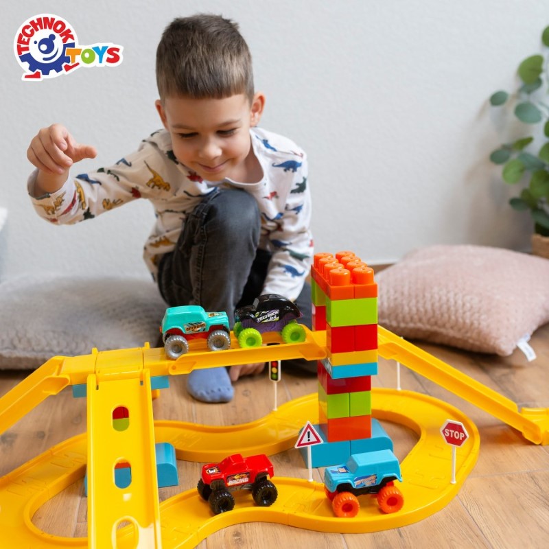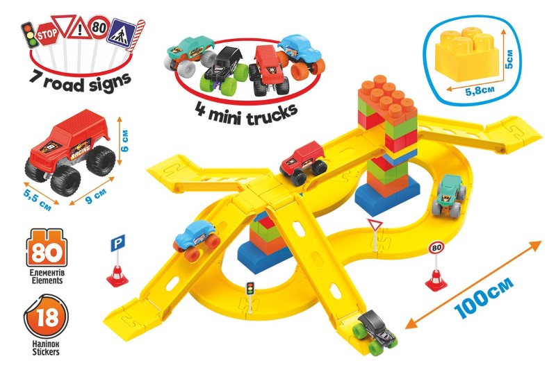Детски конструктор с високоскоростна писта, с която детето може да строи пътища с остри завои и мостове, а след това да се състезава с четири мини-камиона, които също са включени в комплекта.