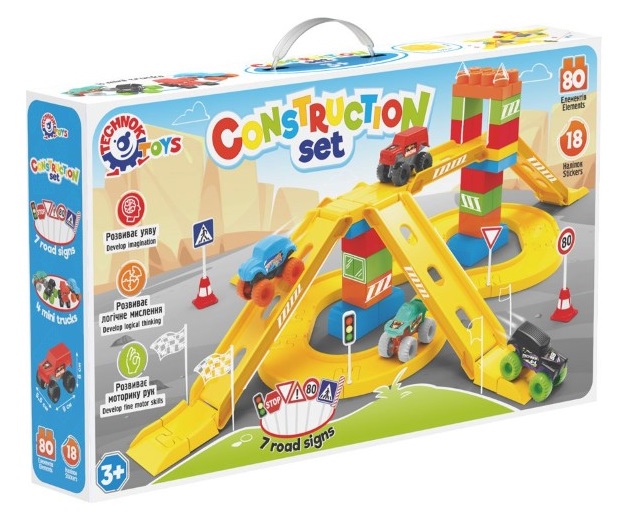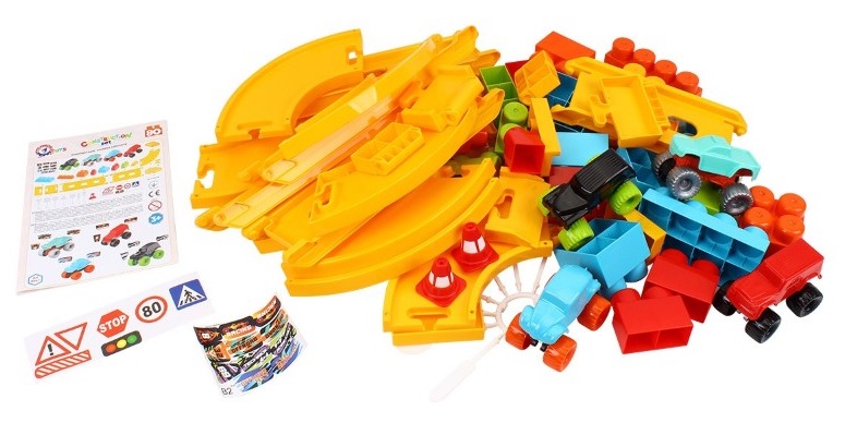 Конструкторът се състои от 80 различни елемента – елементи на писти с кръстовища и завои, наклони, пътни знаци и коли. Градивните елементи са удобни и лесни за свързване. Децата сами избират формата на пътя, тъй като той се състои от различни елементи, като конструктор. Комплектът включва и 7 пътни знака, които ще спомогнат за развитието на паметта, вниманието и наблюдателността на младите автомобилисти.