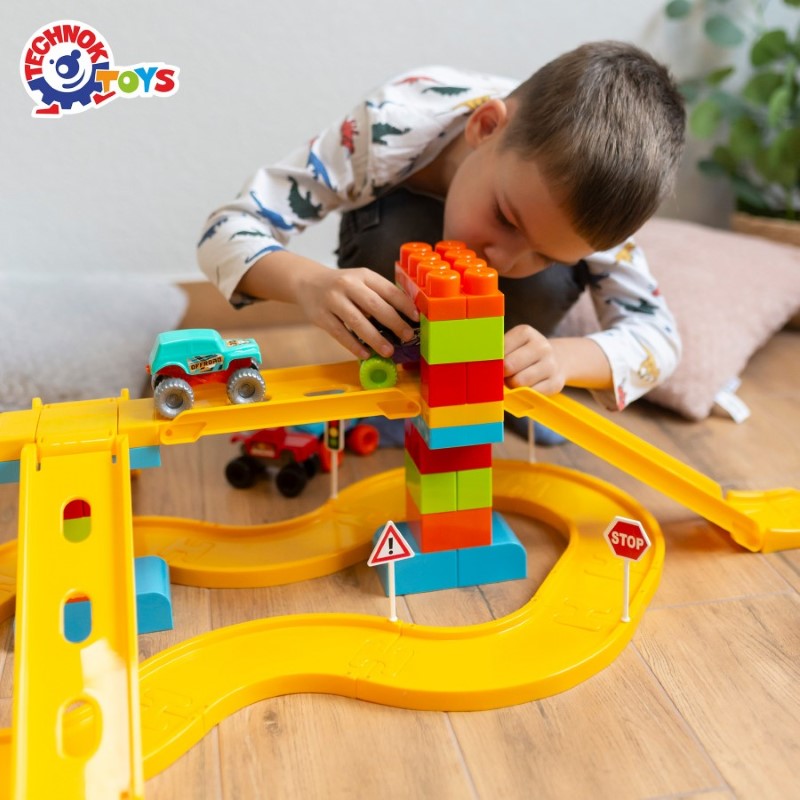 Technok Toys Конструктор с писта, 4 колички и пътни знаци