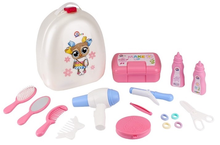 Детска пластмасова раница с включени красиви и необходими аксесоари за ежедневна грижа – гребен, четка, сешоар и маша за косата и други аксесоари.