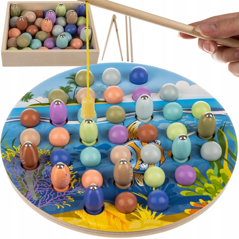 Освен да ловят рибките, децата могат и да упражнят фината си моторика, стремейки се да хващат останалите цветни дървени топчета със специално включените за целта щипки.