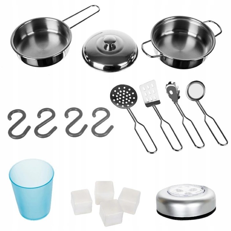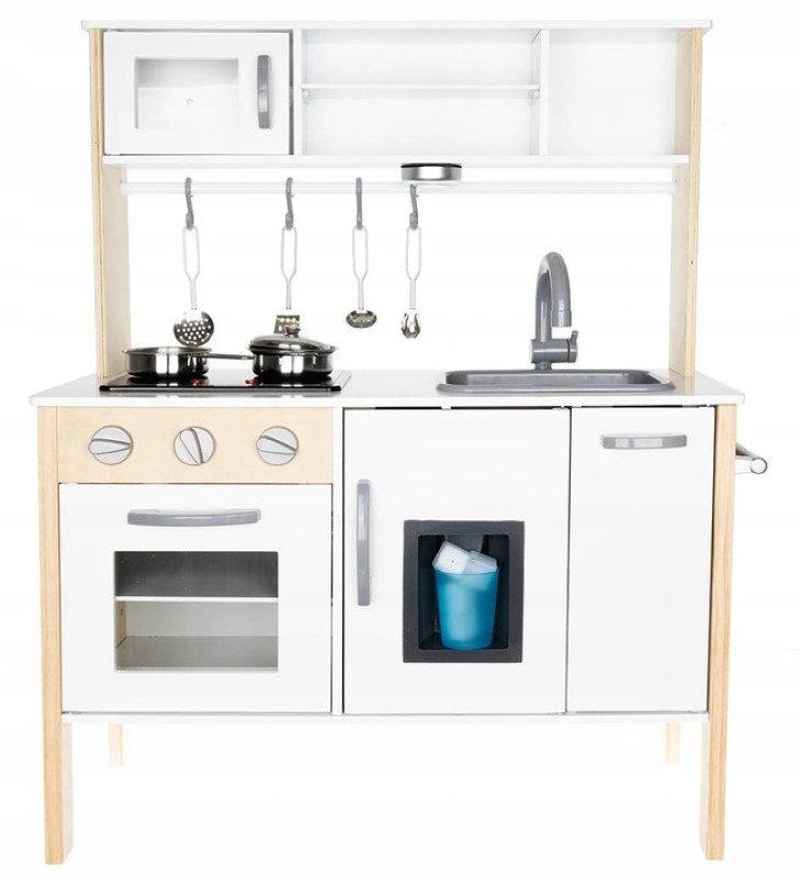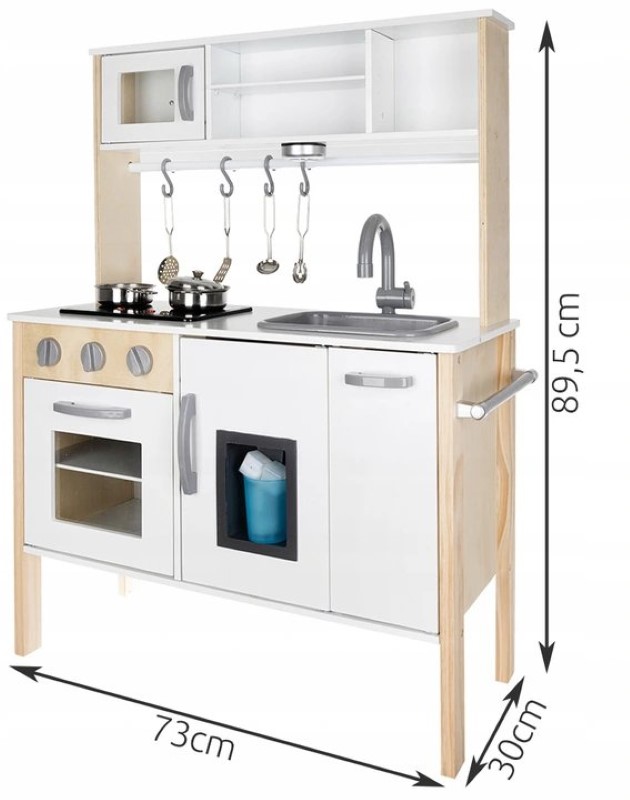 В комплекта има метални съдове за готвене. Кухнята е изработена от дърво и е боядисана с безвредни бои, като е подходяща за момичета и момчета, защото е в неутрален бял цвят.