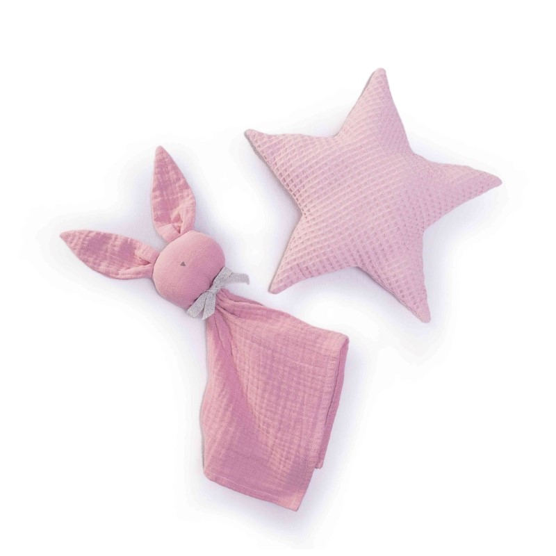 Включва: залъгалка, играчка зайче, възглавница и лигавник.