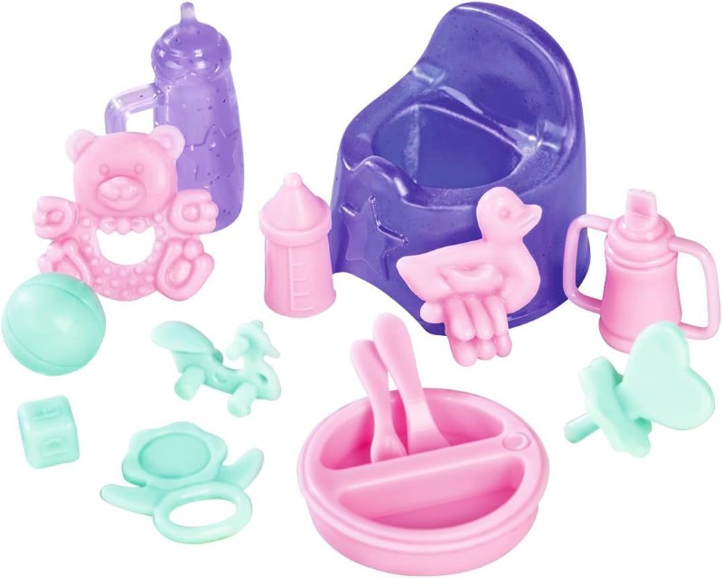 Комплектът включва повече от 15 различни аксесоара, така че Стефи може да храни, да къпе, да разхожда и гушка своето бебе. Бебешкото легло се използва и като практична чанта за носене, така че Стефи може да вземе малкото си бебе навсякъде със себе си.