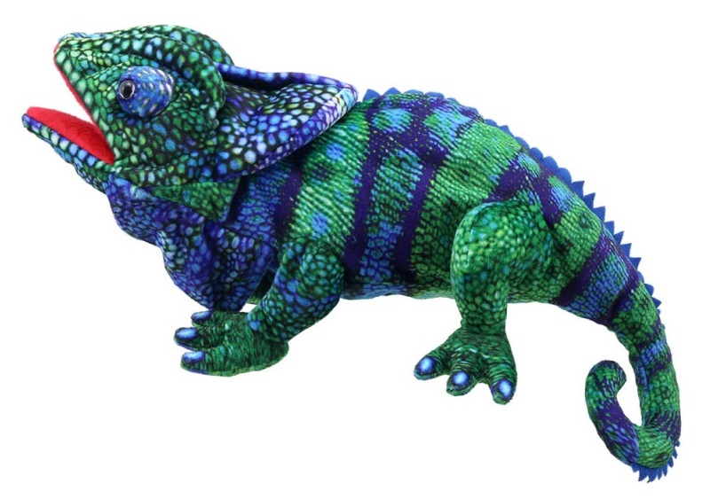 Този синьо-зелен хамелеон е от серията кукли за куклен театър „Големите създания“ и са лесни за управление, имат отлично движение на устата и са направени от страхотни, големи и смели щамповани платове – те наистина спират дъха!