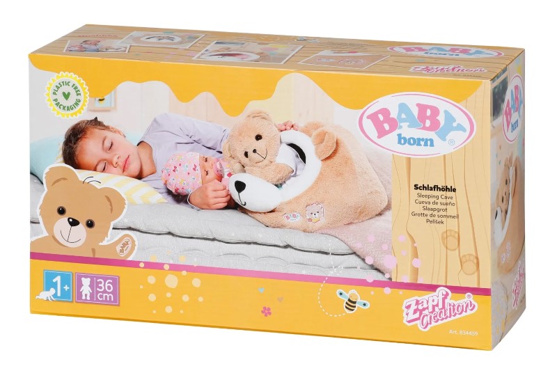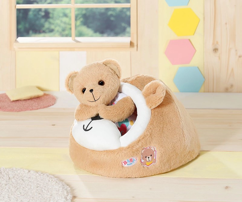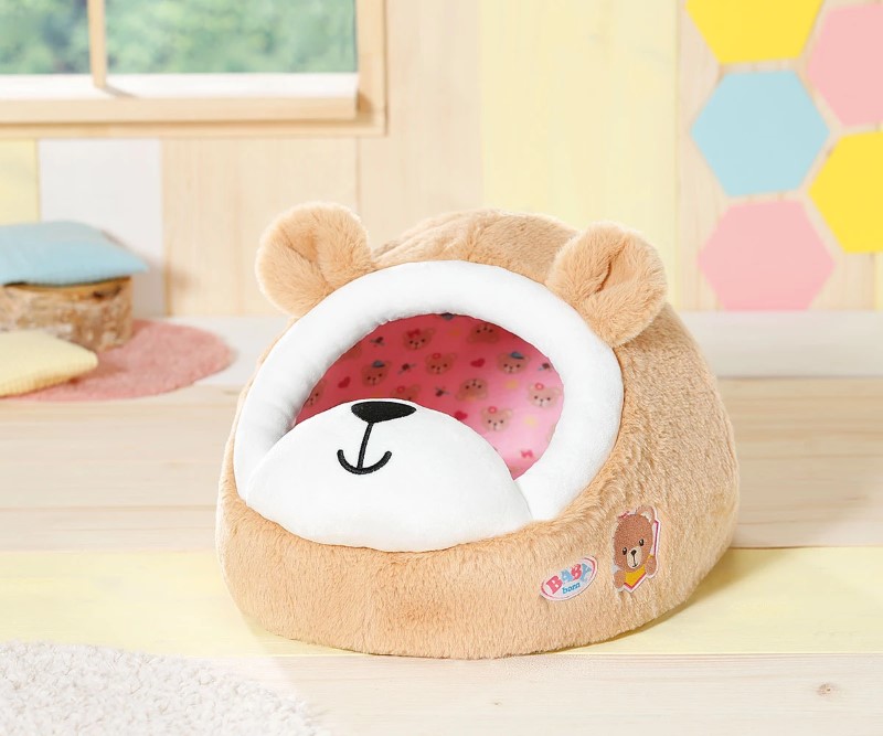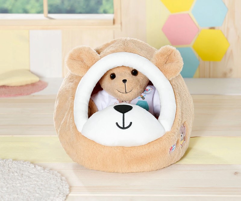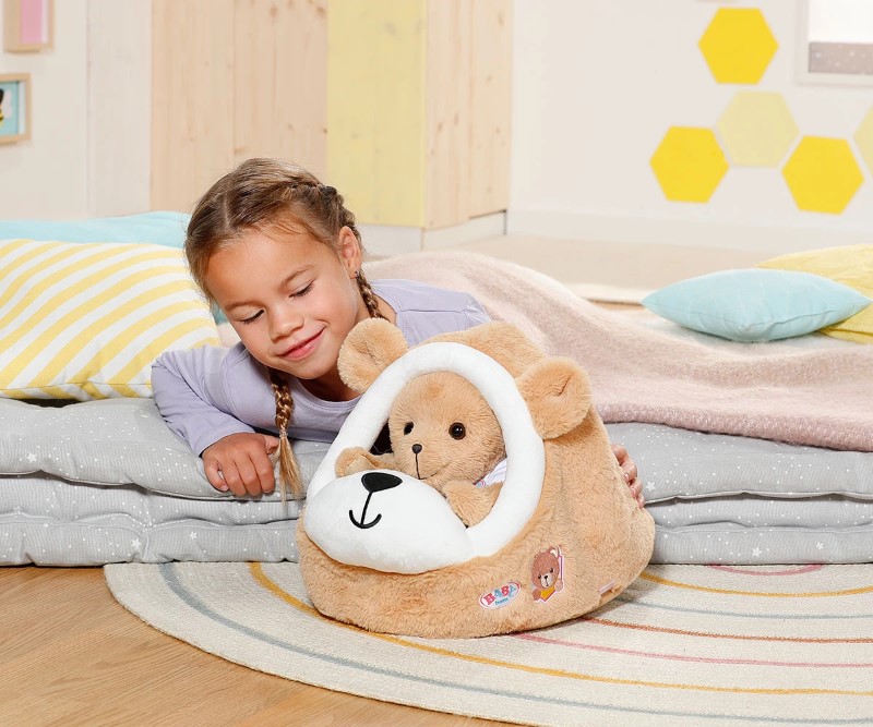 Леглото Baby Born Bear е идеалното решение за осигуряване на комфортен и уютен сън на Вашето дете и любимото му плюшено мече. Самото легло е оформено като глава на мече с меки уши, което му придава атрактивен външен вид и го прави изключително сладко. Топлите цветове и формата му привличат вниманието на децата и добавят повече забавление към играта. Леглото е лесно за пренасяне, което го прави чудесен вариант за използване у дома или по време на пътуване. Играчката насърчава развитието на въображението и ролевите игри при малките деца, като им помага да създават различни игрови ситуации и да развиват тяхната креативност.