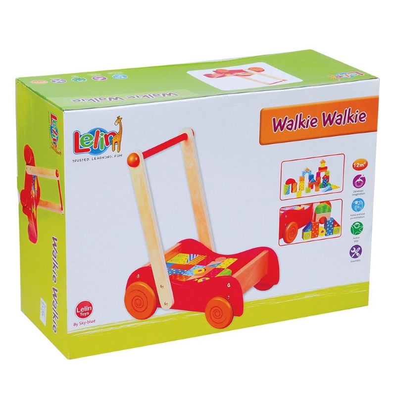 Детска количка изработена от здрава и качествена дървесина, която ще помогне на детето ви да направи първите си стъпки, опитвайки се да я бута напред/назад. Проектирана е така, че детето да може да се движи стабилно и свободно, като се държи за дръжката. А когато се умори да ходи, то може да се забавлява, като подрежда, реди и сортира цветните дървени блокчета (30 броя). Количката е с гумирани колела и не оставя следи по пода. С нея вашият малчуган ще може да превозва и любимите си играчки, както и да се разхожда навън.