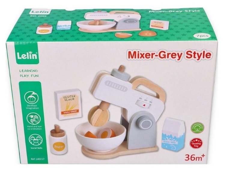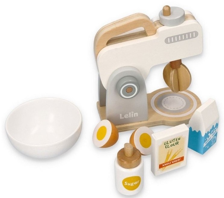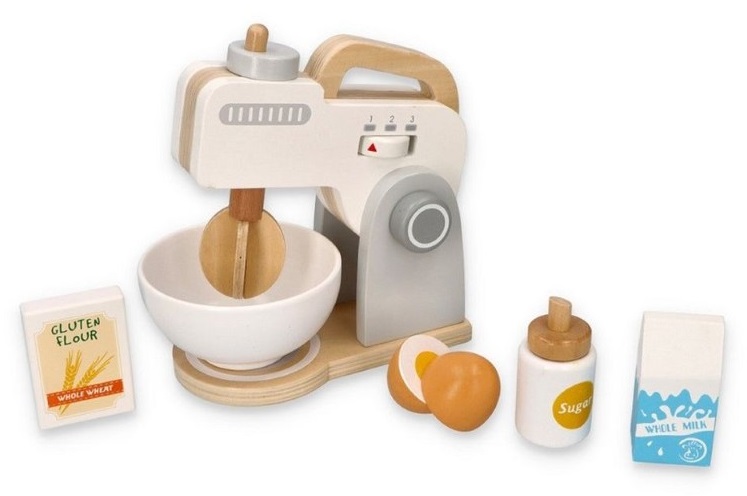 Дървен миксер с продукти, с който децата ще могат да приготвят различни вкусни сладкиши. Игрите с него помагат за развиване на творческите игри, социалните умения, разпознаването на хранителните продукти, развиване на въображението и комуникативните умения.