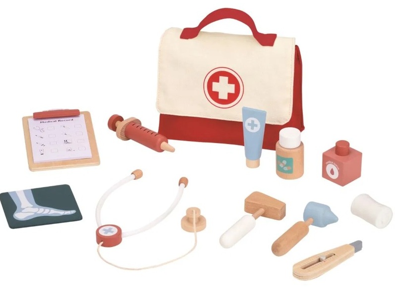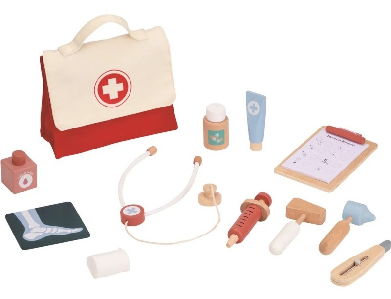 Докторският комплект се състои от здрава платнена чанта с цип и практични дръжки, пълна с инструменти за преглед, изработени от дърво, подходящи за деца.