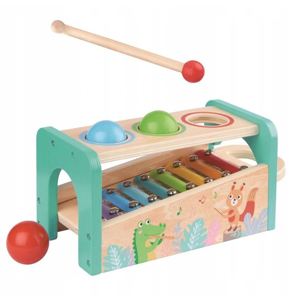 Детски комплект предлагащ на децата една интересна двойна комбинация за безкрайни забавления, включваща ксилофон с метални пластини и палка с гумен връх и игра с чукче и три дървени топки: червена, зелена и синя.